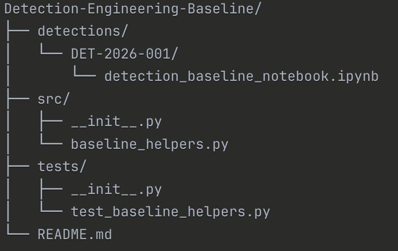 This repo uses one folder per baseline/detection ID, plus a shared helper module. It’s designed to make baselines easy to review and keep statistical methods consistent across detections.