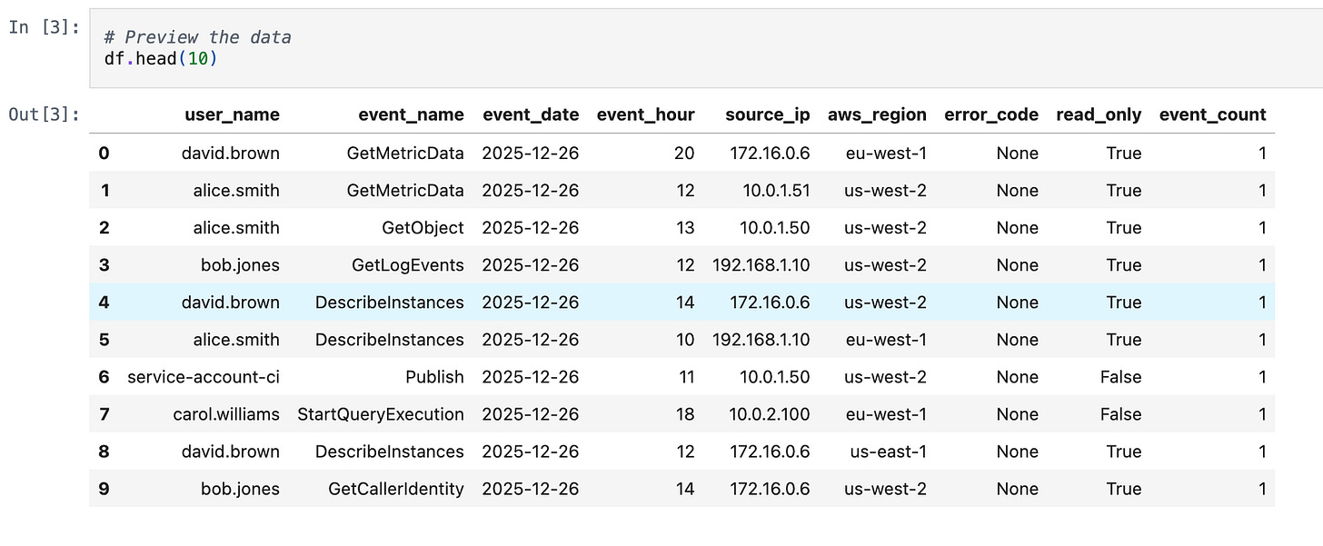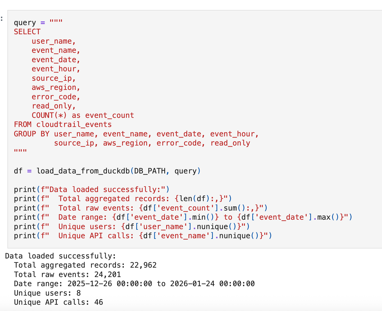We’re working with 30 days of synthetic CloudTrail data containing 24,201 events across 8 users and 46 unique API calls.
